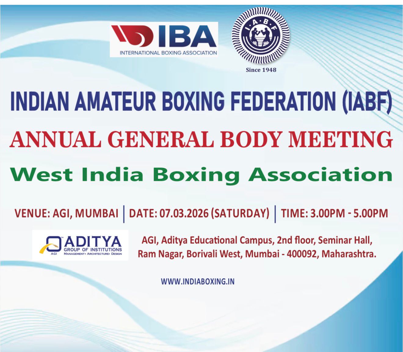 मुंबई। इंडियन एमेच्योर बॉक्सिंग फेडरेशन (IABF) के अंतर्गत पश्चिम क्षेत्र की बॉक्सिंग एसोसिएशन की महत्वपूर्ण बैठक 7 मार्च 2026 (शनिवार) को मुंबई में आयोजित की जा रही है। यह बैठक वेस्ट इंडिया बॉक्सिंग एसोसिएशन के तत्वावधान में आयोजित होगी।